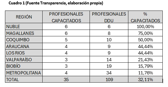 En el Cuadro 1 muestra la realidad informada por 8 regiones objeto del análisis. Si damos una mirada al ratio PORCENTAJE CAPACITADOS que, relaciona el número de profesionales capacitados comparados con el total de profesionales de la DDU respectiva, las cifras presentan rangos bajísimos en aquellas regiones que envuelven a centros urbanos con mayor atracción para el desarrollo de proyectos de carácter inmobiliario, así se observa en Valparaíso, Bio-bío y la Región Metropolitana presentan, lo cual resulta preocupante a la luz de las nuevas tareas que deberán enfrentar, poniendo en duda el cumplimiento de plazos y por ende la deseada agilización de permisos.