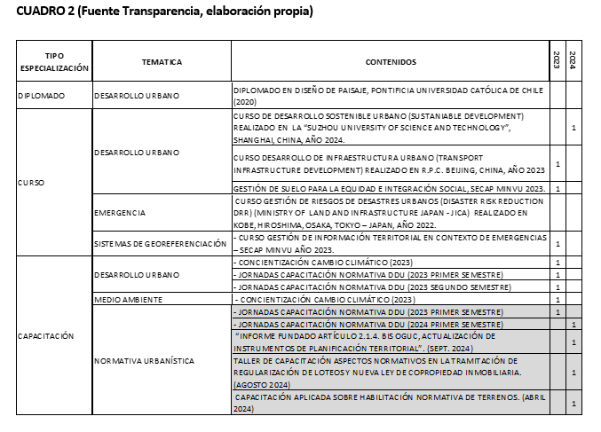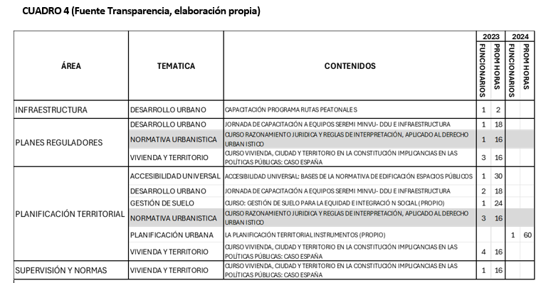 El Departamento de Desarrollo Urbano La SEREMI de Valparaíso cuenta, según los registros de transparencia, con 14 funcionarios, de los cuales la información arroja que, en los últimos cuatro años, sólo 3 funcionarios de los 14 han recibido capacitación en el área de estudio, mediante cursos relacionados con la especialización en interpretación en normativa vinculadas a la LGUC, su ordenanza e IPTs, sin perjuicio de la capacitación relacionadas a otros ámbitos ajenos al área de análisis abordado en este informe.
