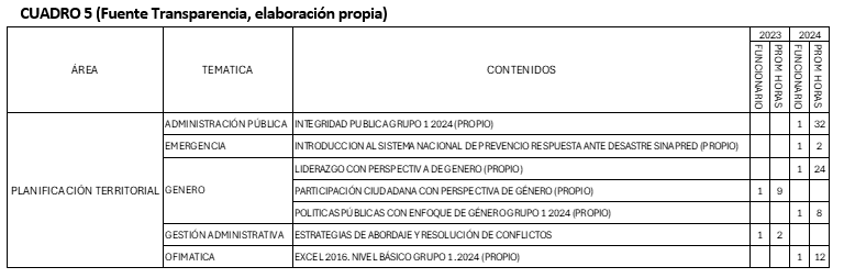 La información evidencia además que en 2024 el volumen de actividades relacionadas con el desarrollo de competencias específicas en el rubro es casi nulo, así se observa en el cuadro 5, con capacitaciones enfocadas en otras habilidades complementarias a la labor interpretativa y resolutiva en materia de normativa de urbanismo y construcción de la DDU regional, como es por ejemplo la capacitación en temas de género. Cabe destacar que estas capacitaciones obedecen a cursos desarrollados por motivación propia de los funcionarios (pagados por ellos), lo que circunscribe aún más el área de injerencia de la institución en orden a las temáticas desarrolladas más bien de carácter genéricas que pensadas en el desarrollo de competencias que mejoren el conocimiento y desempeño de los funcionaros.