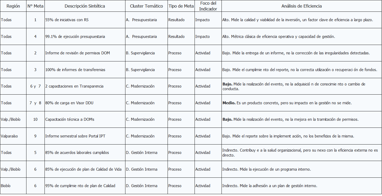 Estas metas son, en su mayoría, de proceso. Miden el cumplimiento de acuerdos y la ejecución de actividades planificadas. Si bien son importantes para la salud organizacional, su impacto directo en la eficiencia de la entrega de servicios a la ciudadanía es indirecto. No obstante, el análisis de este clúster revela diferencias sutiles pero significativas en las prioridades regionales. La ausencia de una meta explícita sobre "Calidad de Vida y Clima Laboral" en la Región Metropolitana, presente en las otras dos, es notable.